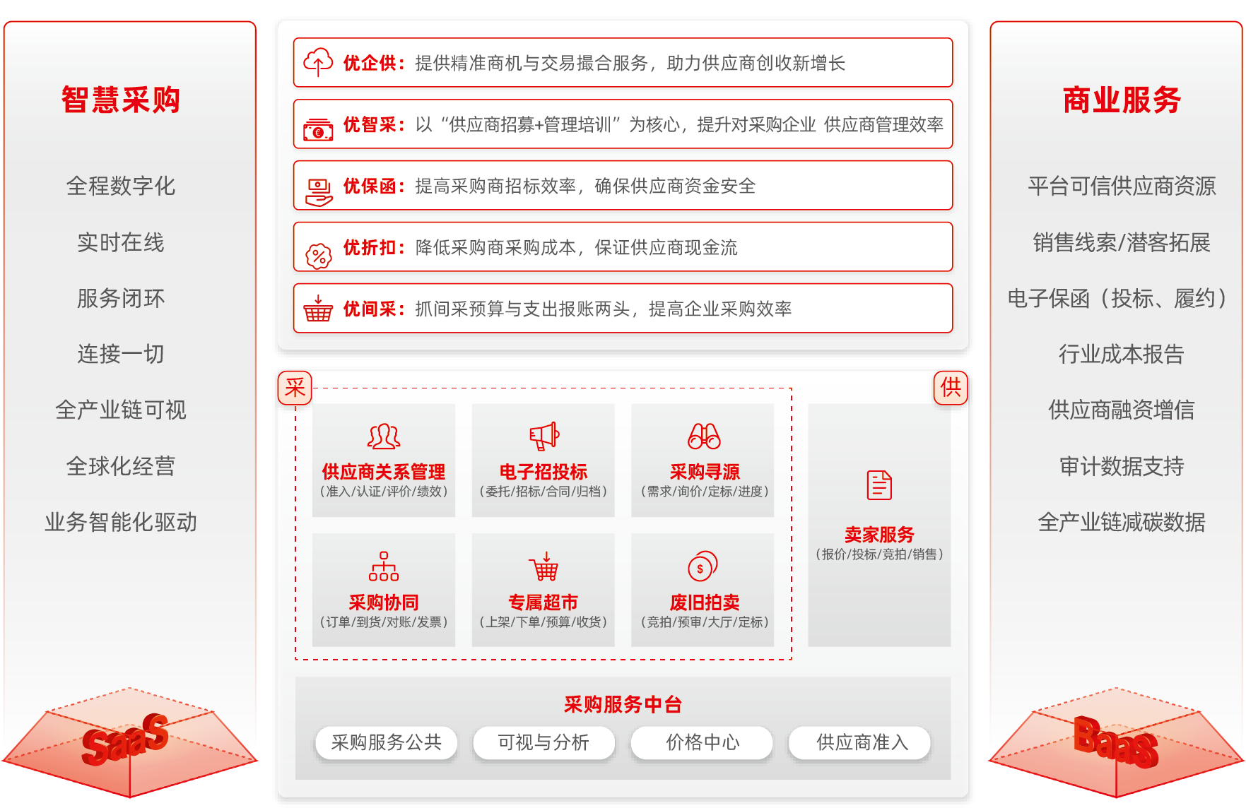 社會化網絡交易平臺:以連接、協同、共享、創新為核心理念,立足需方構建涵蓋采購尋源(招標/談判/詢價)、合同中心、采購協同、云采超市、廢舊拍賣、可視與分析、供應商關系管理的社會化網絡交易平臺