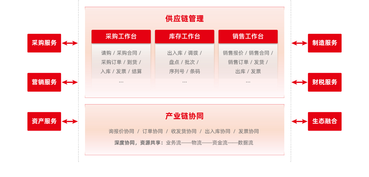 供應鏈云將采購、生產、銷售、庫存、服務等活動緊密銜接在一起,提供完整供應鏈服務, 實現企業內部產供銷、業財稅一體化。通過社會化協同,將上游與下游企業涉及的供應商、生產商、 分銷商等企業間的商流、物流、信息流、資金流形成一體化運作。通過開放的生態融合服務,為企業提供更完善的供應鏈服務,從而不斷提升企業供應鏈管理水平,實現敏捷供應、高效協同。