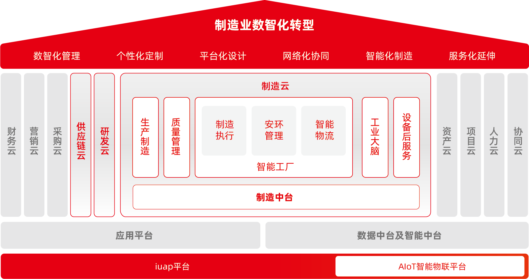 用友制造云旨在幫助大型、多制造模式、多工廠的集團型制造業管控 安全、提高質量、縮短交期、提升效率、降低成本,同時連接社會化商業網絡,支持制造企業面向數智化管理、個性化定制、 網絡化協同、智能化制造、服務化延伸構建數字化能力,由此提升綜合競爭力,實現數智化轉型。
